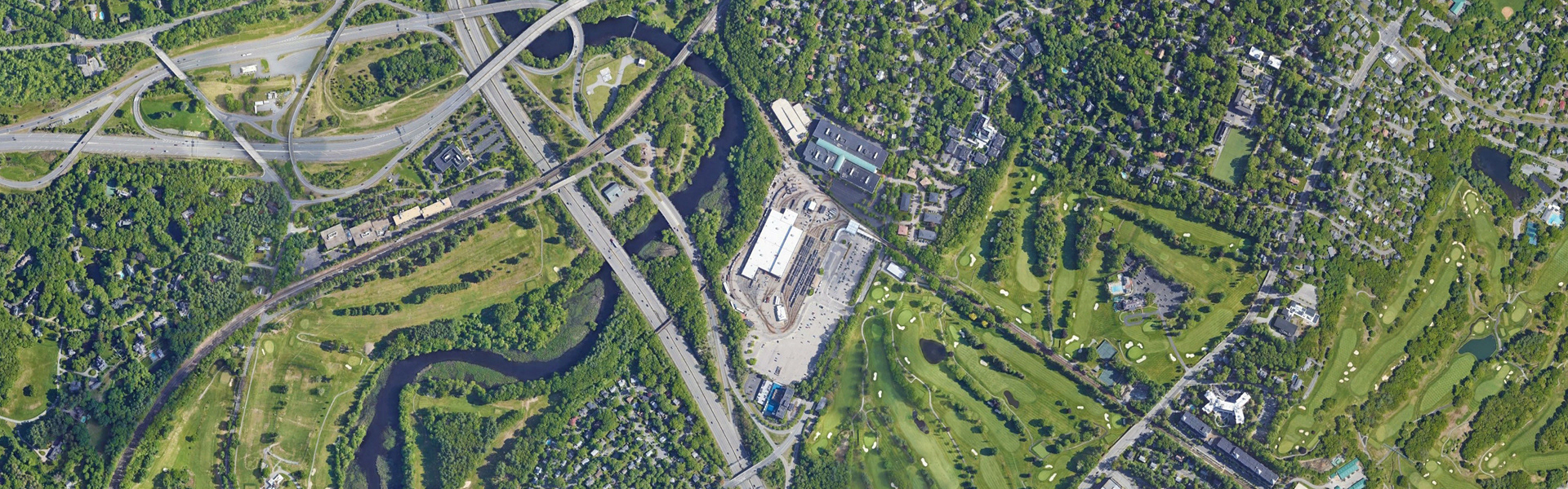 The Riverside MBTA Station sits along the confluence of I-90 and I-95, and between the villages of Newton Lower Falls and Auburndale.